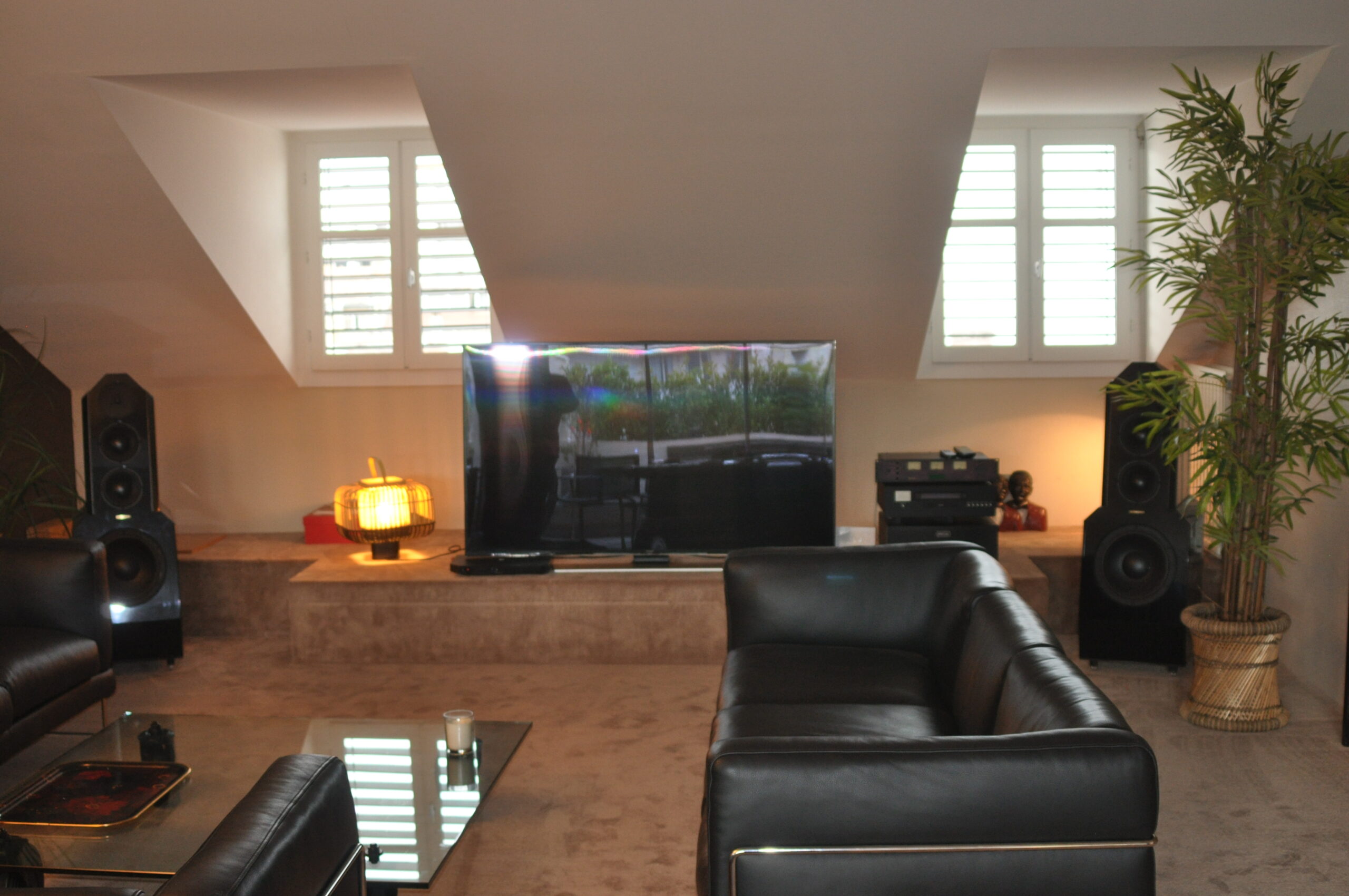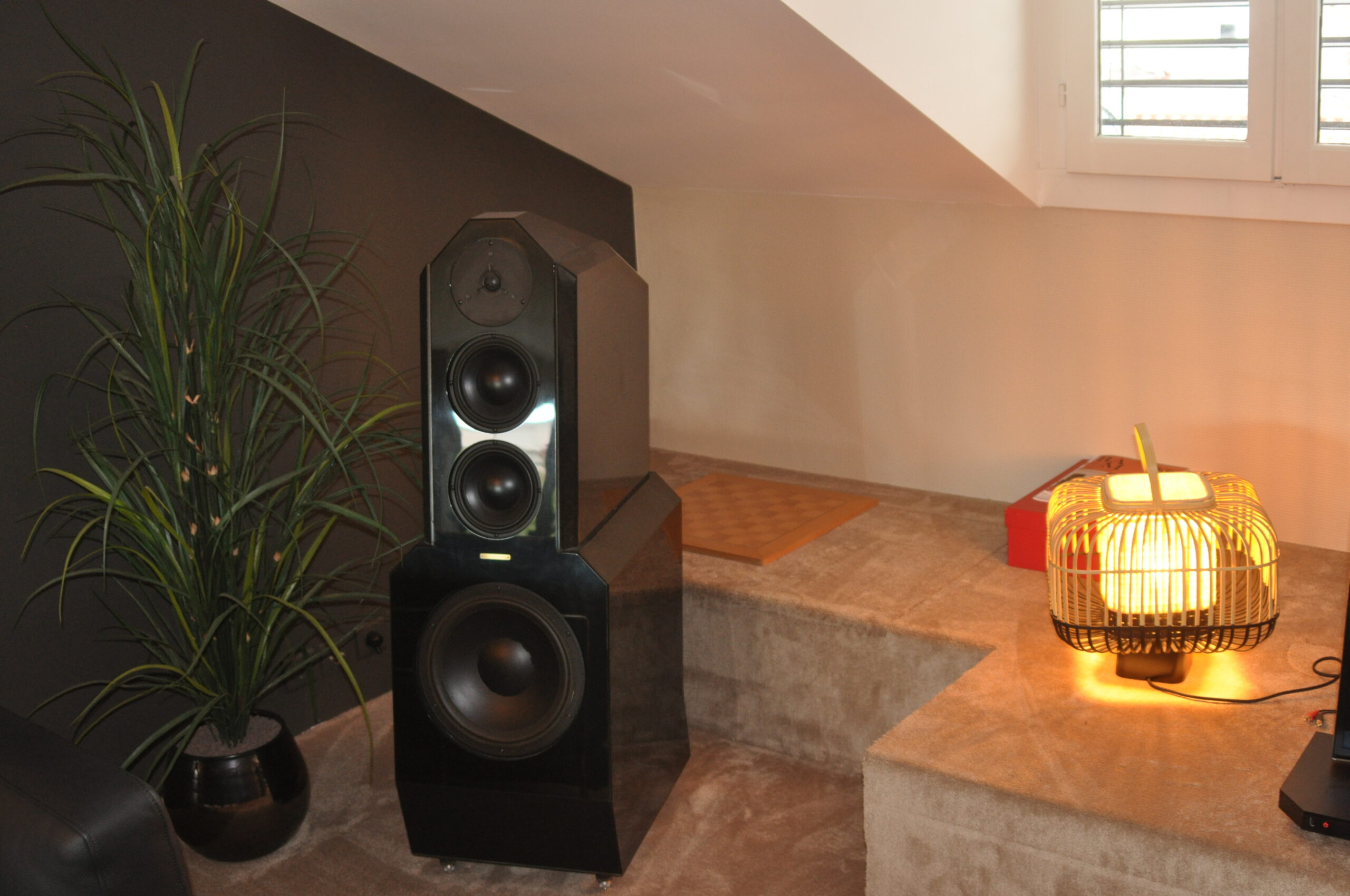 Les enceintes sont composées comme suit : le fameux Tweeter Dynaudio Esotar pour reproduire le registre aigue, 2 HP Morel, des références, pour la partie Medium non filtrée et pour le registre grave ce sont 2 HP Dynaudio 30cm en position dite « isobarique » (charge qui consiste à utiliser deux haut-parleurs identiques et à les faire fonctionner ensemble l’un derrière l’autre, avec un volume clos entre eux). Le résultat obtenu est un registre grave avec beaucoup d’ampleur et d’énergie qui descend très bas, sans distorsions ni boursoufflures, le 18Hz est atteint avec seulement 3 dB d’atténuation !